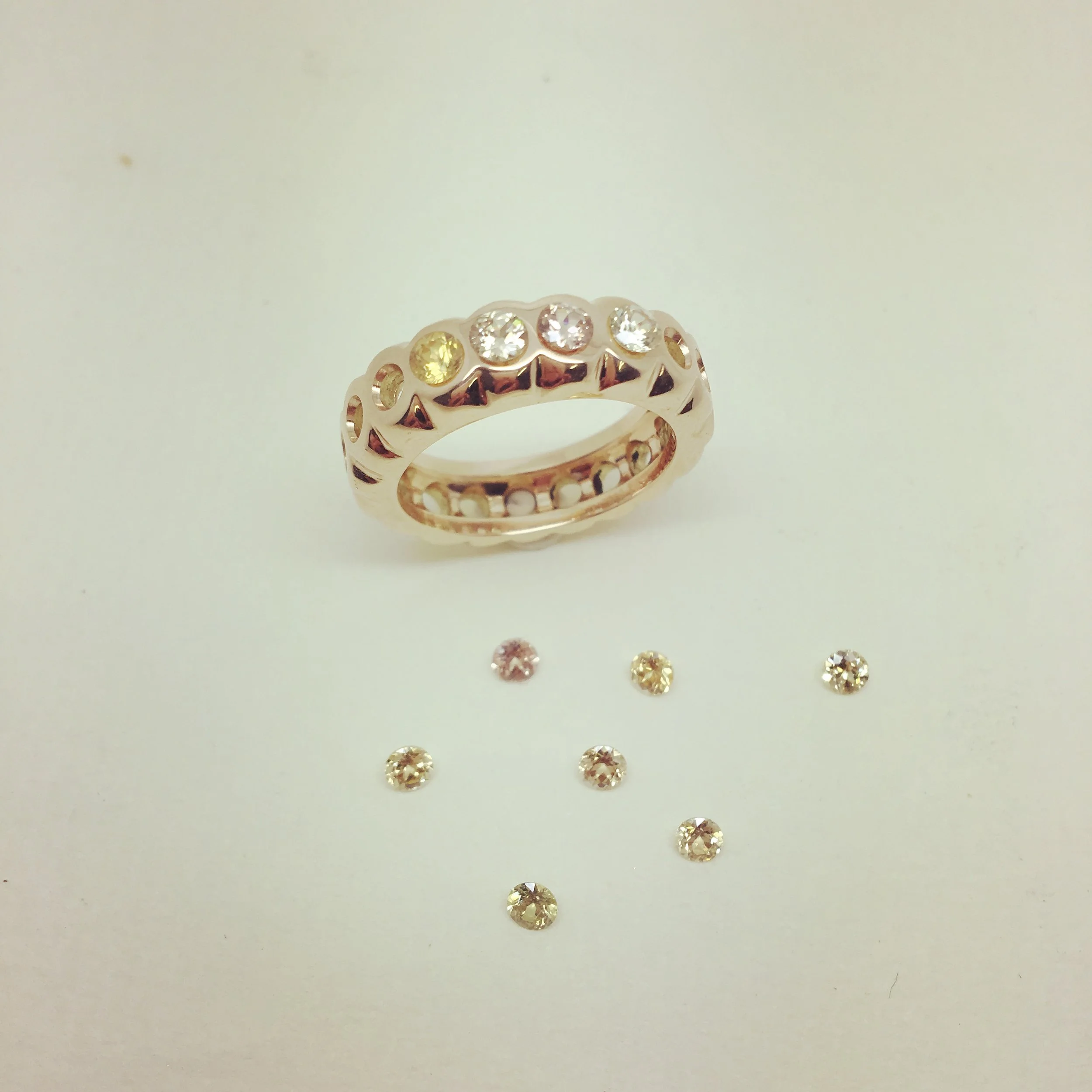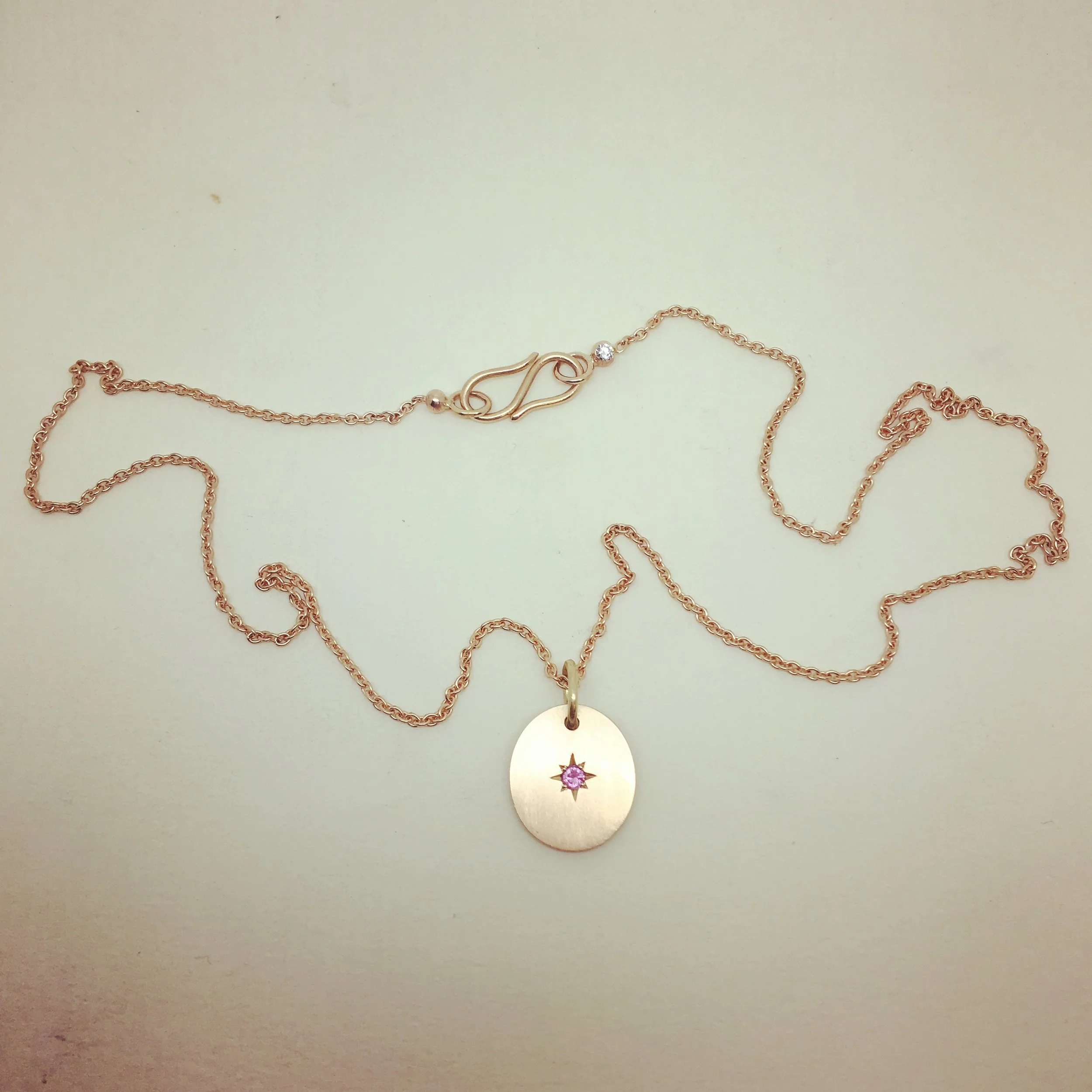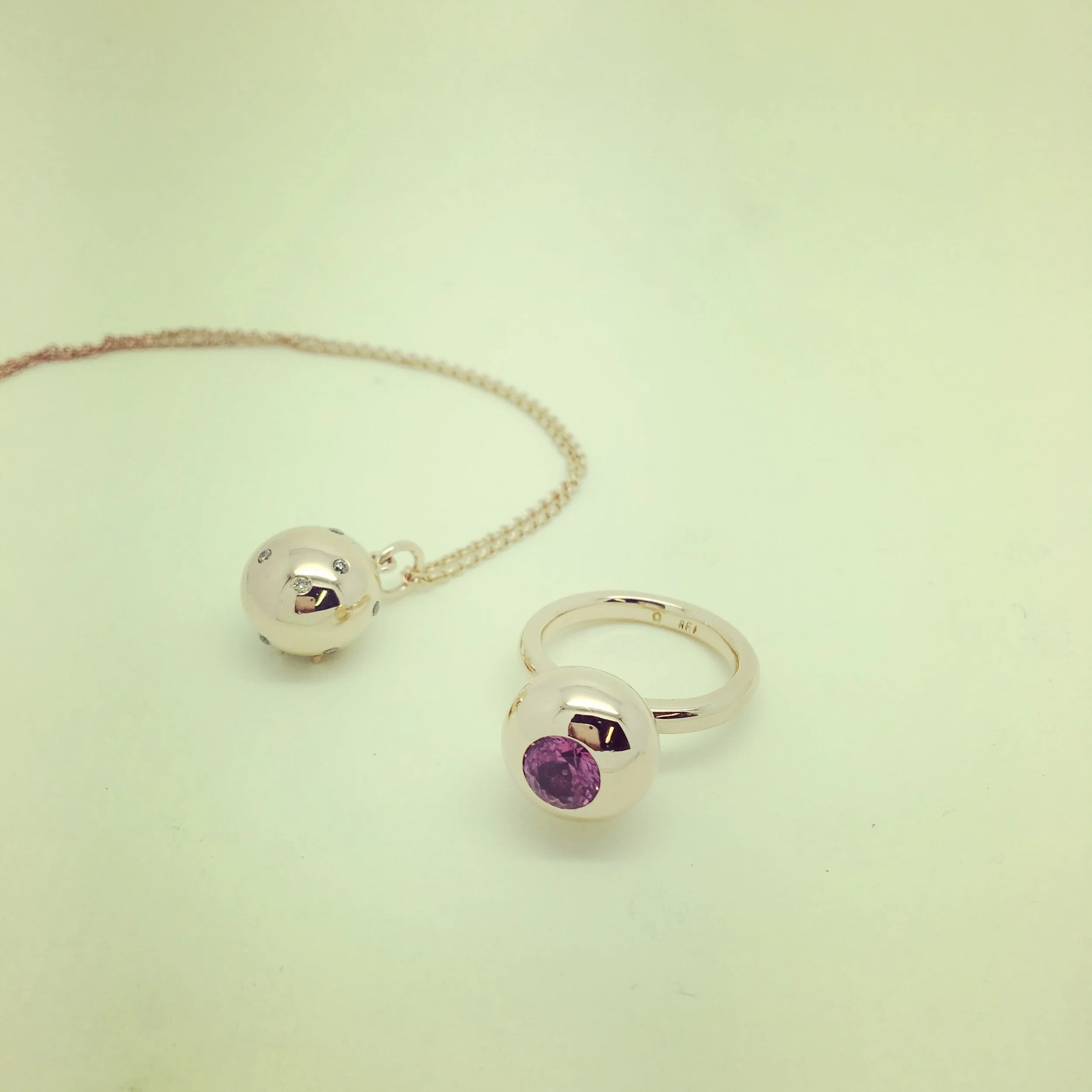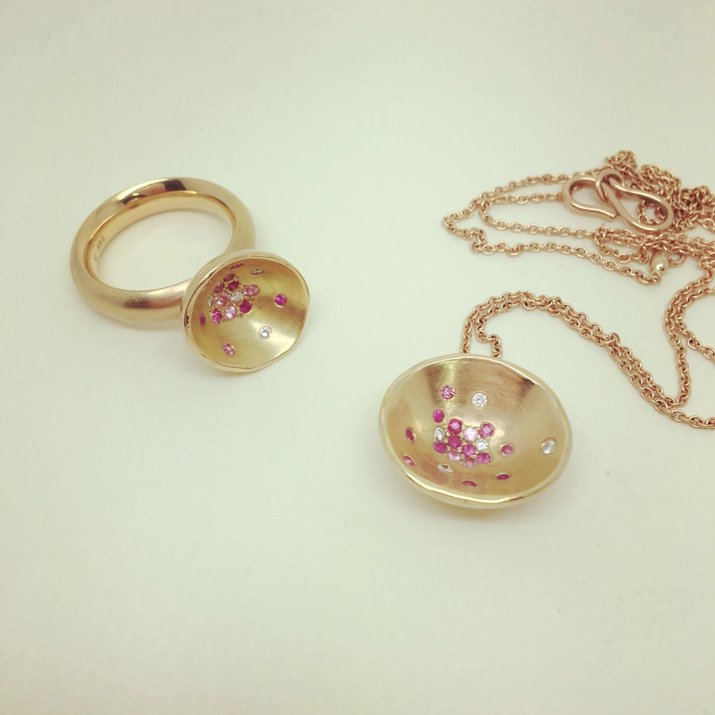 Ring und Kette in 750/000 Rotgold mit Saphiren